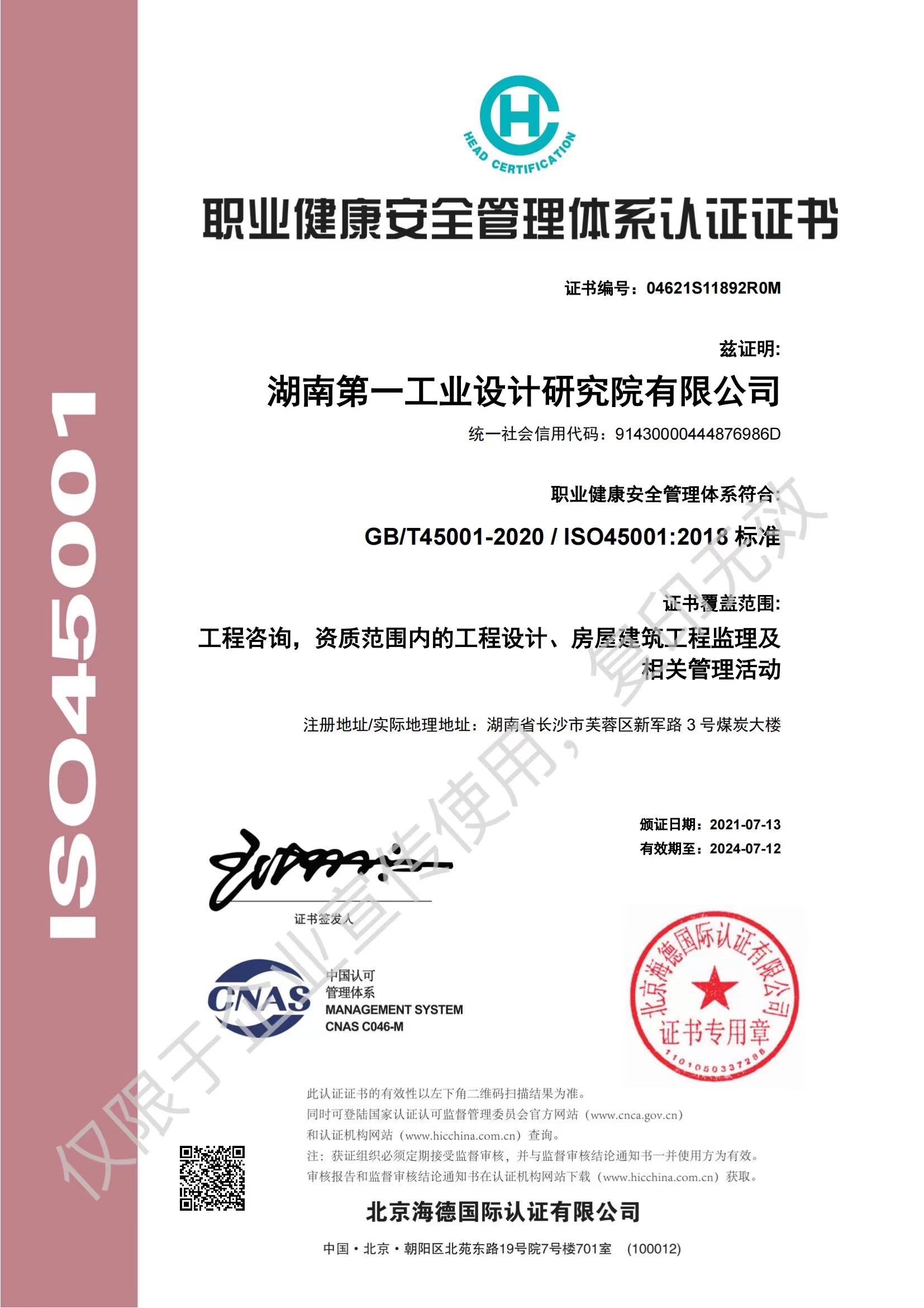 ISO45001職業健康管理體系認證證書…